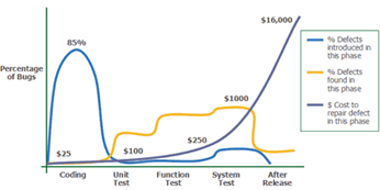 Figure [1][i] Security testing cost vs. time – The cost of fixing software bugs